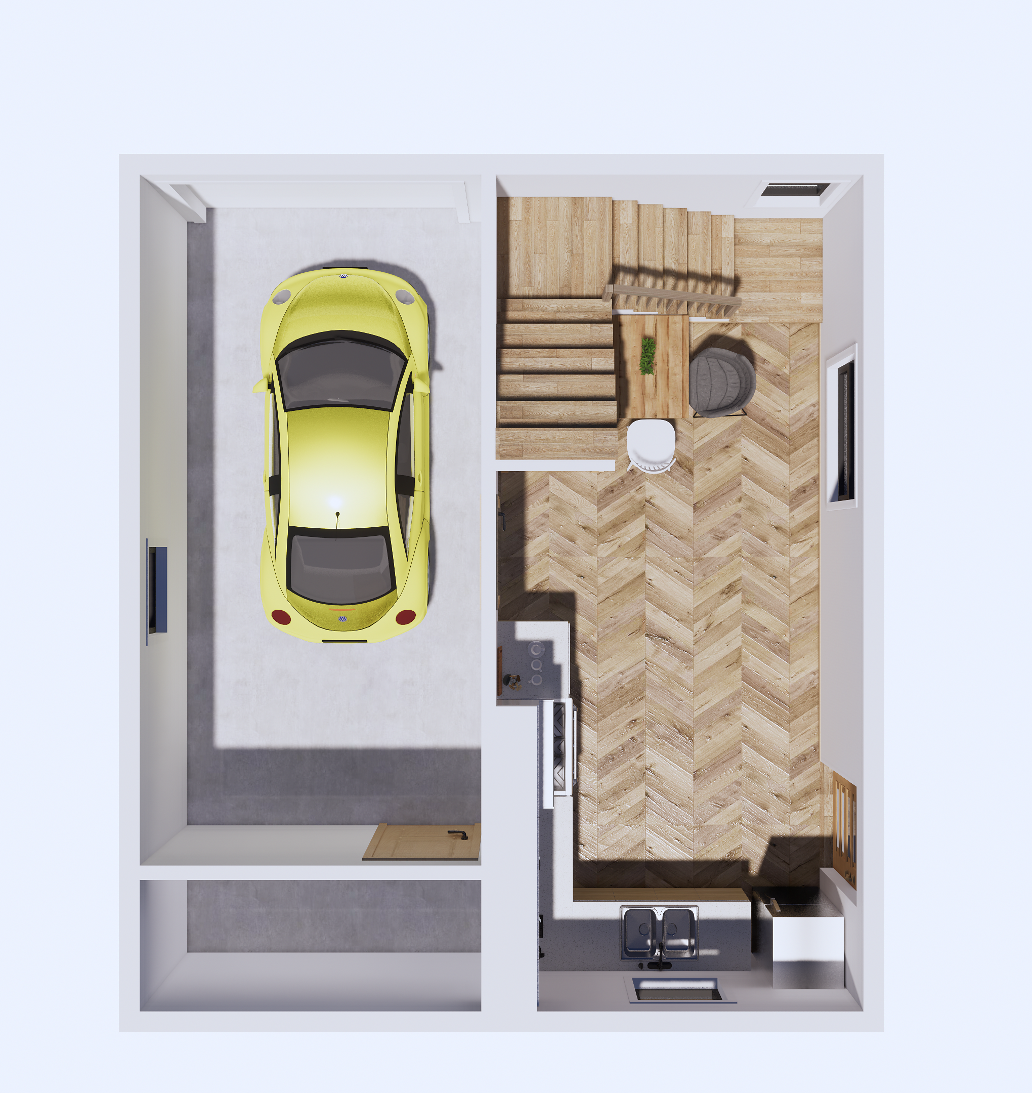 2 層、 1 臥室、 2 廳、 1 衛(wèi)生間、 1 露臺、 1 車庫、